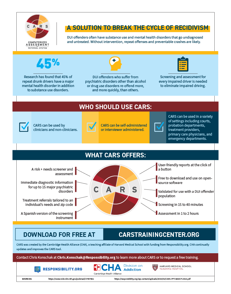 Responsibility.org is a proud sponsor of the groundbreaking Computerized Assessment and Referral System (CARS) screening and assessment tool which was released in June 2017 and is now in use across the nation. You can download CARS for free at the CARS Training Center.