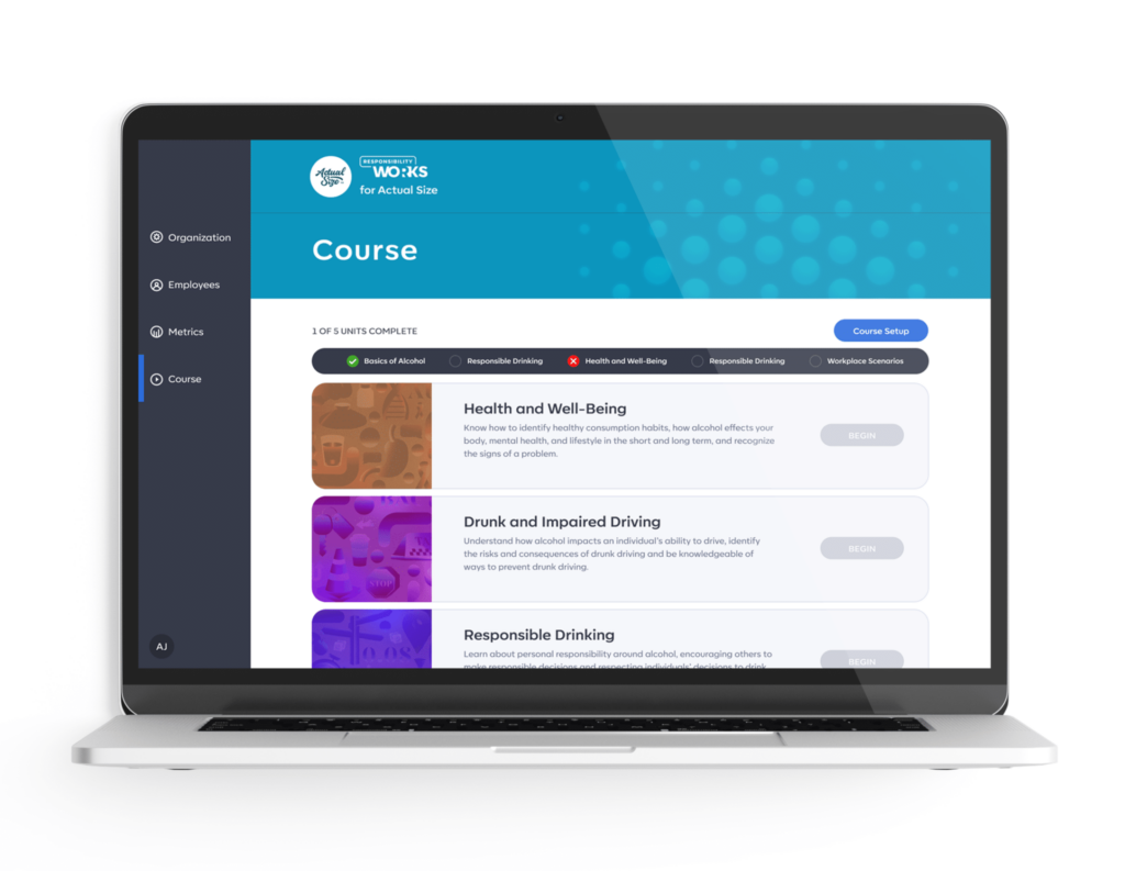 The program includes five units that can be assigned to employees. Each unit consists of learning objectives, interactive content, and a summative assessment to keep employees engaged while learning more about alcohol and responsibility. Units include: