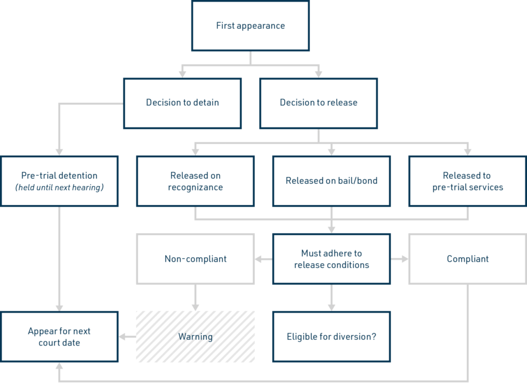 In most cases, unless the defendant is deemed to be a significant threat to public safety or accused of a violent crime, pre-trial release is likely. The judge sets release conditions, which often include supervision, screening and assessment and prohibition from consuming alcohol and drugs.