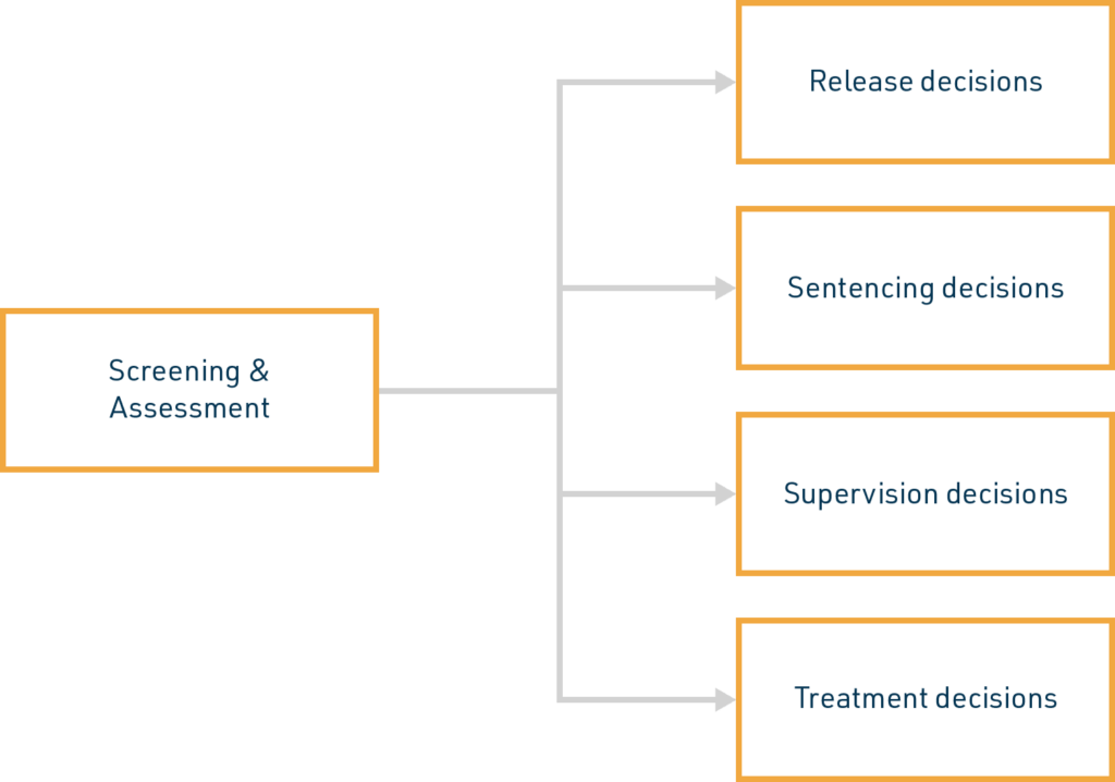 The results from screening and assessment together should be used to inform sentencing decisions, case management plans, supervision strategies, and treatment referrals and plans. Assessments should be repeated at multiple points of an offender’s involvement in the criminal justice system to identify progress and to inform changes to supervision and treatment plans.