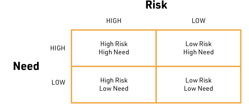 An offender can fall into one of four categories: high risk/high need; high risk/low need; low risk/high need; and low risk/low need. The majority of repeat impaired drivers as well as polysubstance offenders will be classified as high-risk on account of their propensity to repeatedly engage in dangerous criminal behavior. But being high-risk does not automatically mean that an individual also has high needs. Many repeat DUI offenders are high-risk/low need and benefit from intensive supervision but minimal treatment.