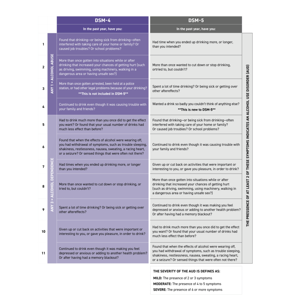 Figure: Comparison of DSM-IV and DSM-5 criteria for diagnosing alcohol abuse and alcohol dependence vs. alcohol use disorder