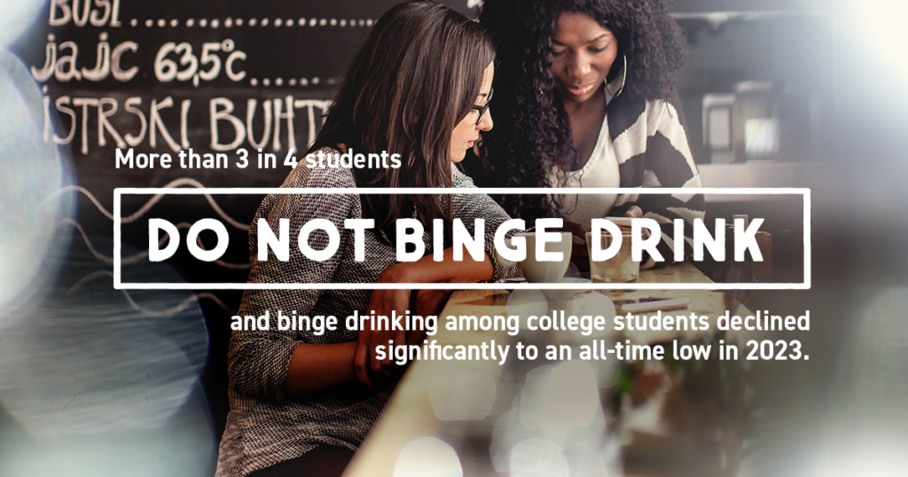 Binge drinking is not a rite of passage. The majority of college students do not binge drink and even more do not engage in extreme levels of binge drinking. According to the 2024 Monitoring the Future Panel Study, one in five (22%) college students report engaging in binge drinking (having five or more drinks in a row in the past two weeks). However, the prevalence of binge drinking among college students declined significantly (21 percent proportionally), reaching a new historic low in 2023 – from 27.7 percent in 2022 to 21.9 percent in 2023.