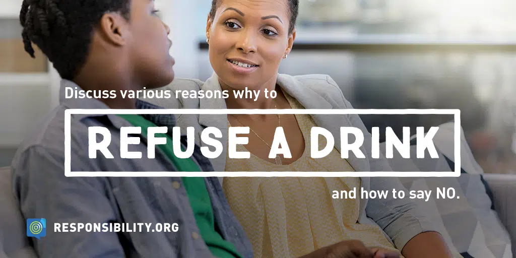 Before sending your high school graduate off to college, discuss your family beliefs, attitudes, and expectations when it comes to alcohol. Discuss various reasons why to refuse a drink and how to say NO. These may include:
